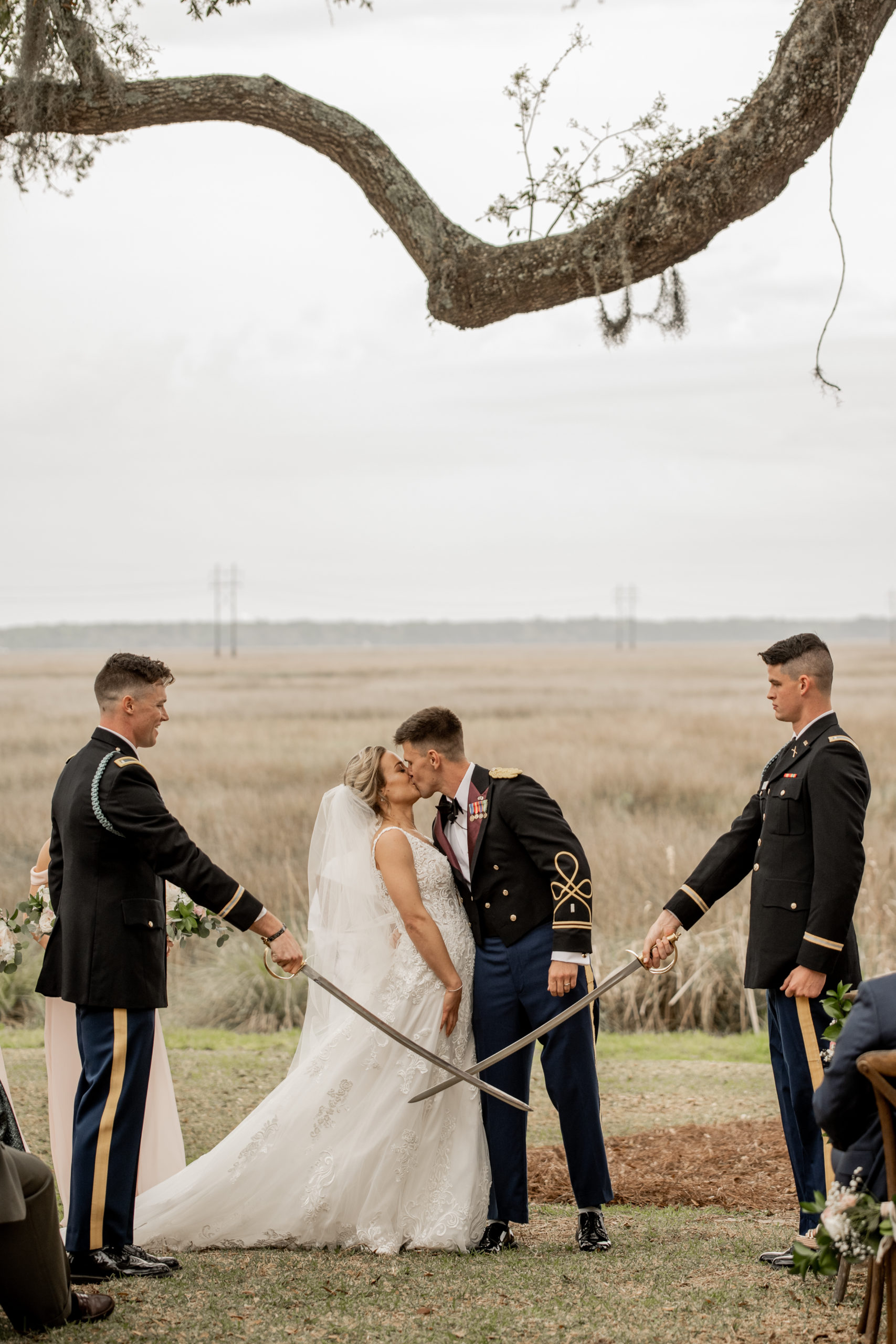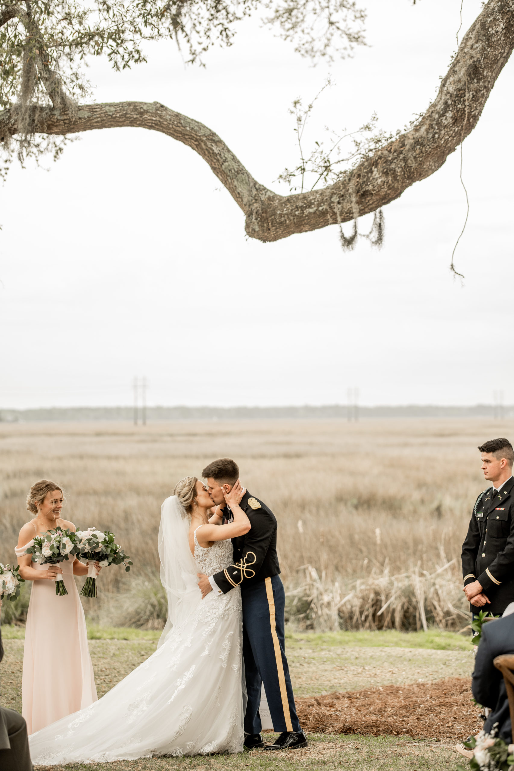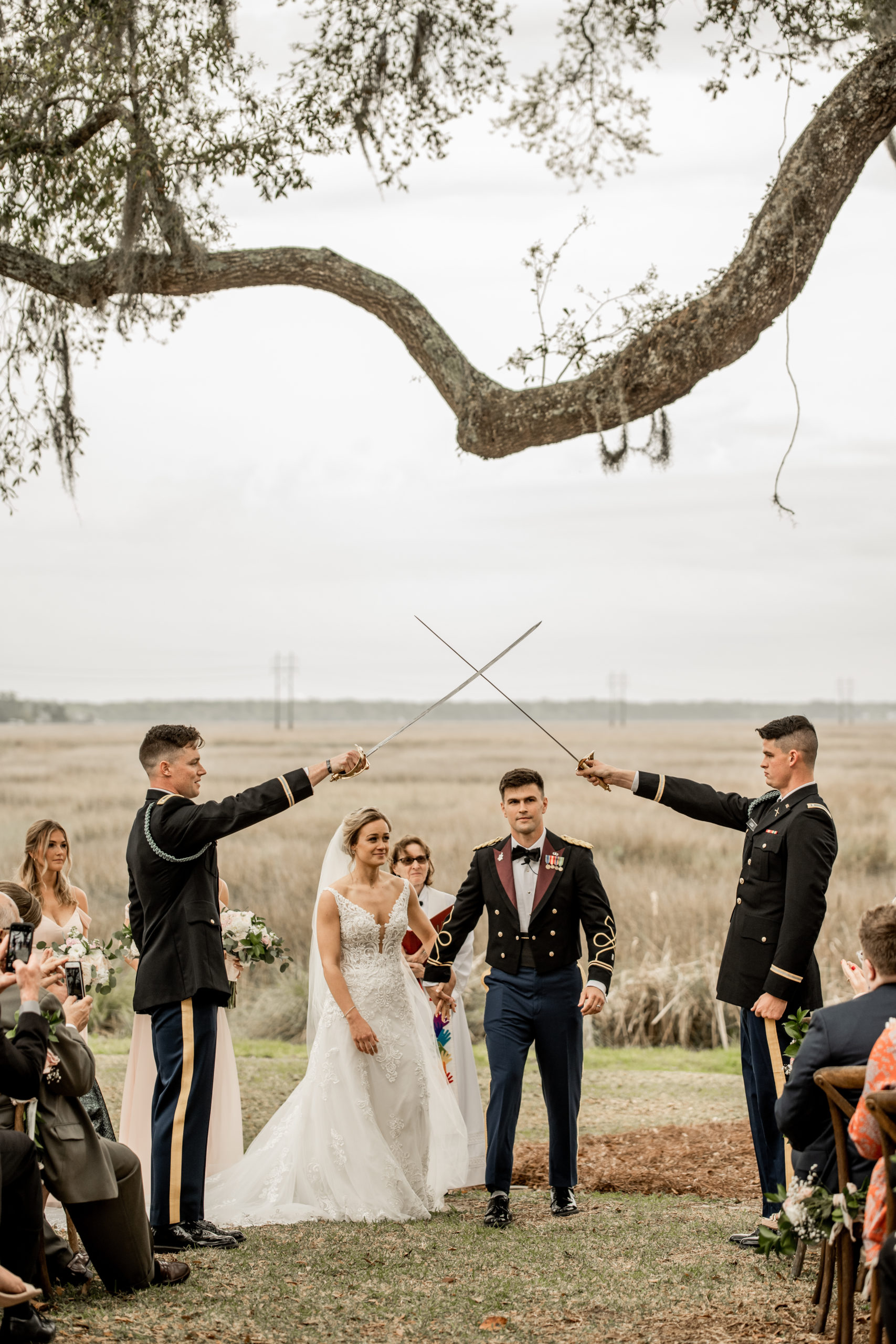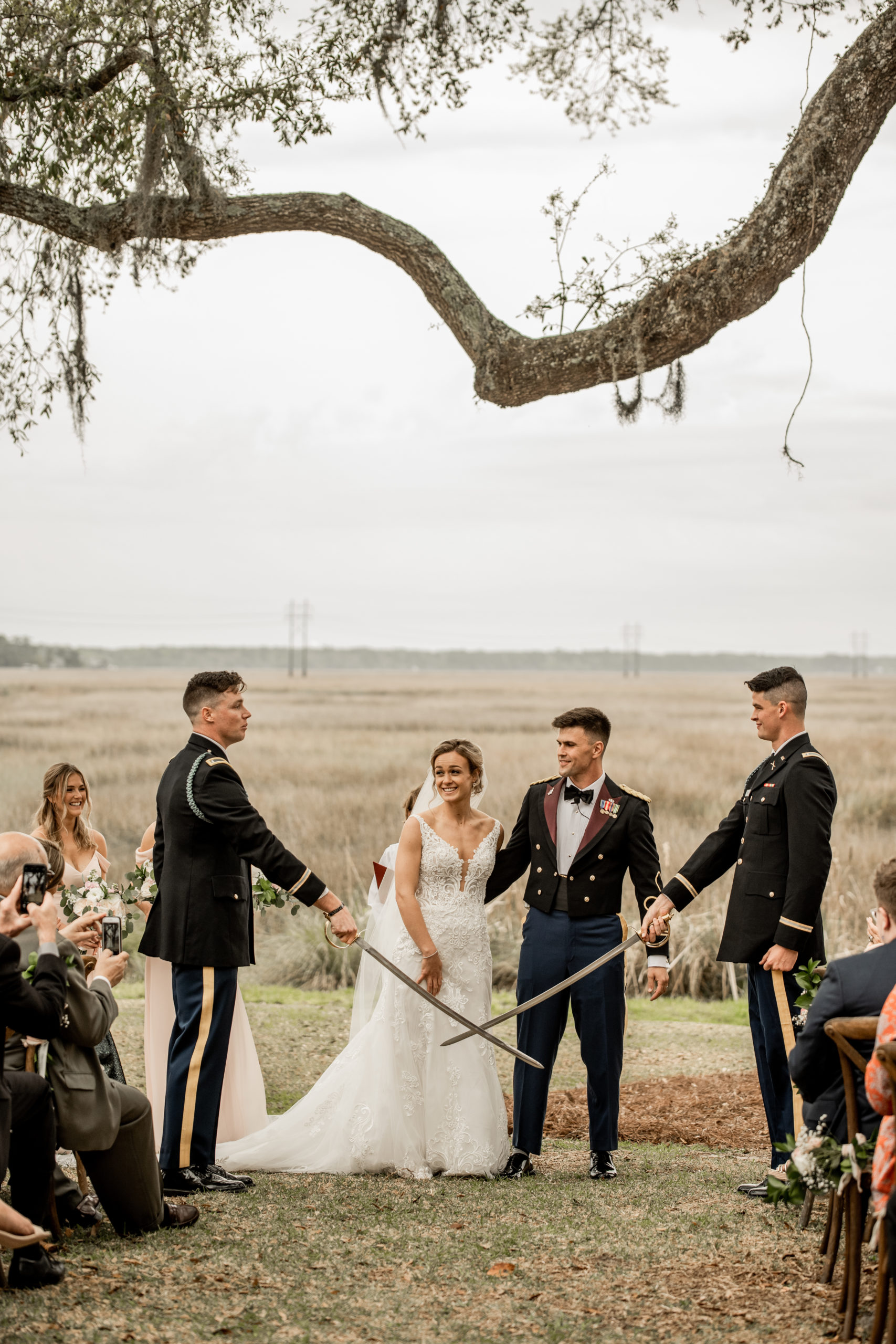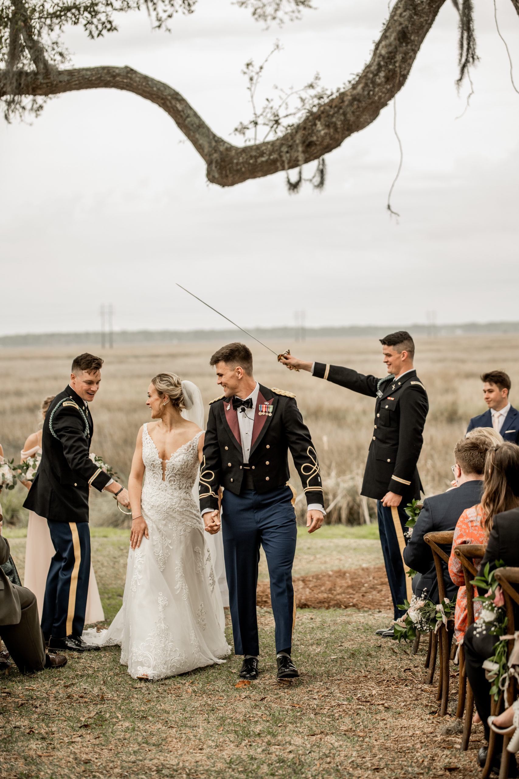 With a beautiful backdrop of the marsh, Ashley and Forrest tied the knot! It was a very emotional ceremony, but the bride’s brother actually cried more than anyone else! After sharing their personal, loving vows, the newlyweds exited through a traditional military sword arch (plus a sword tap on the booty!)