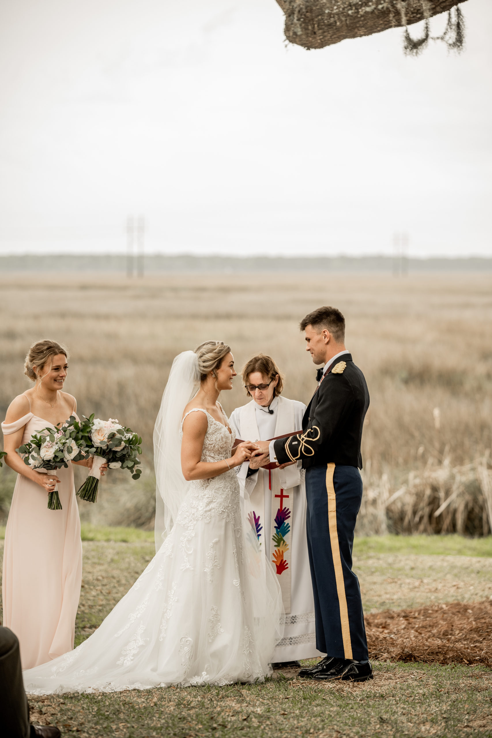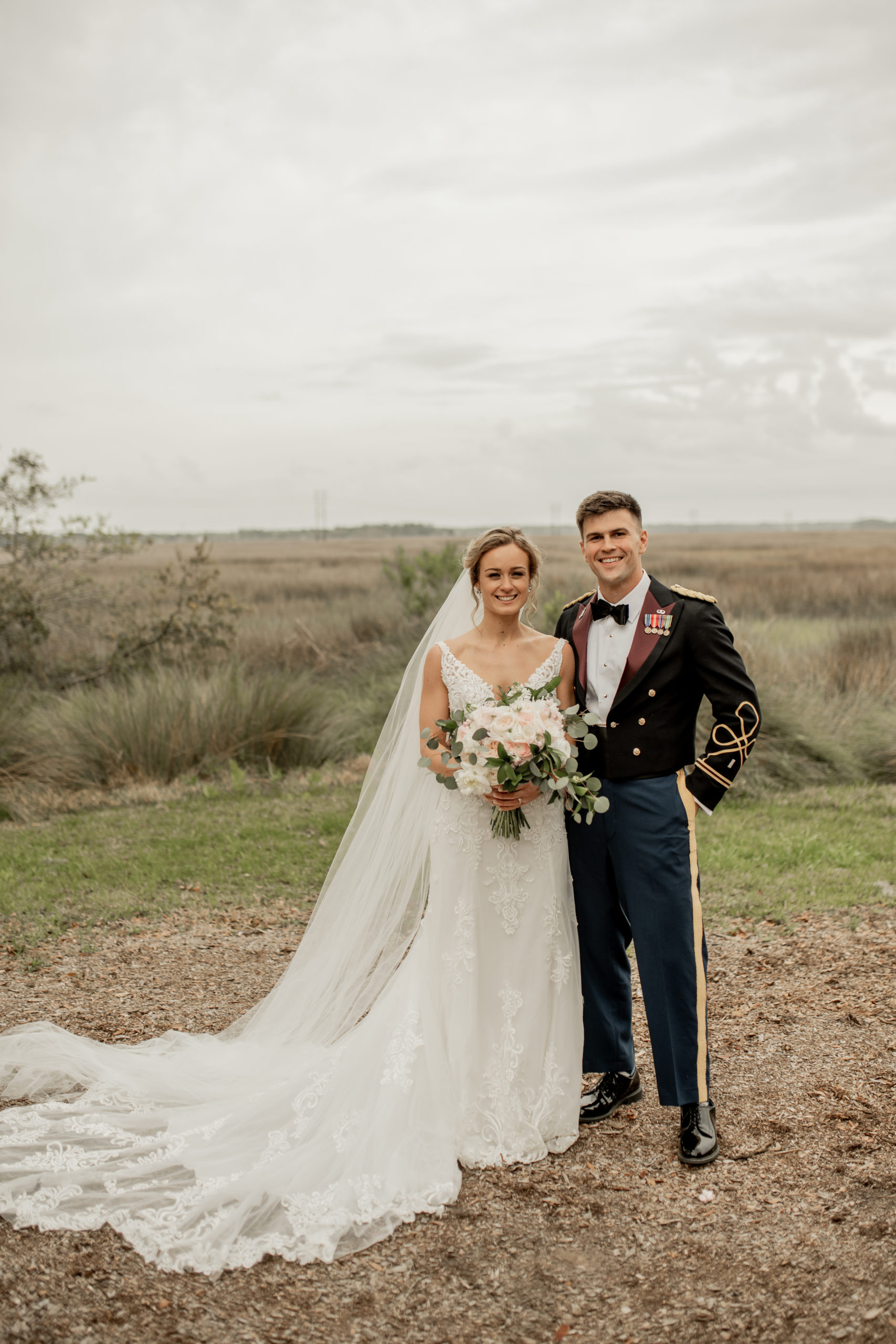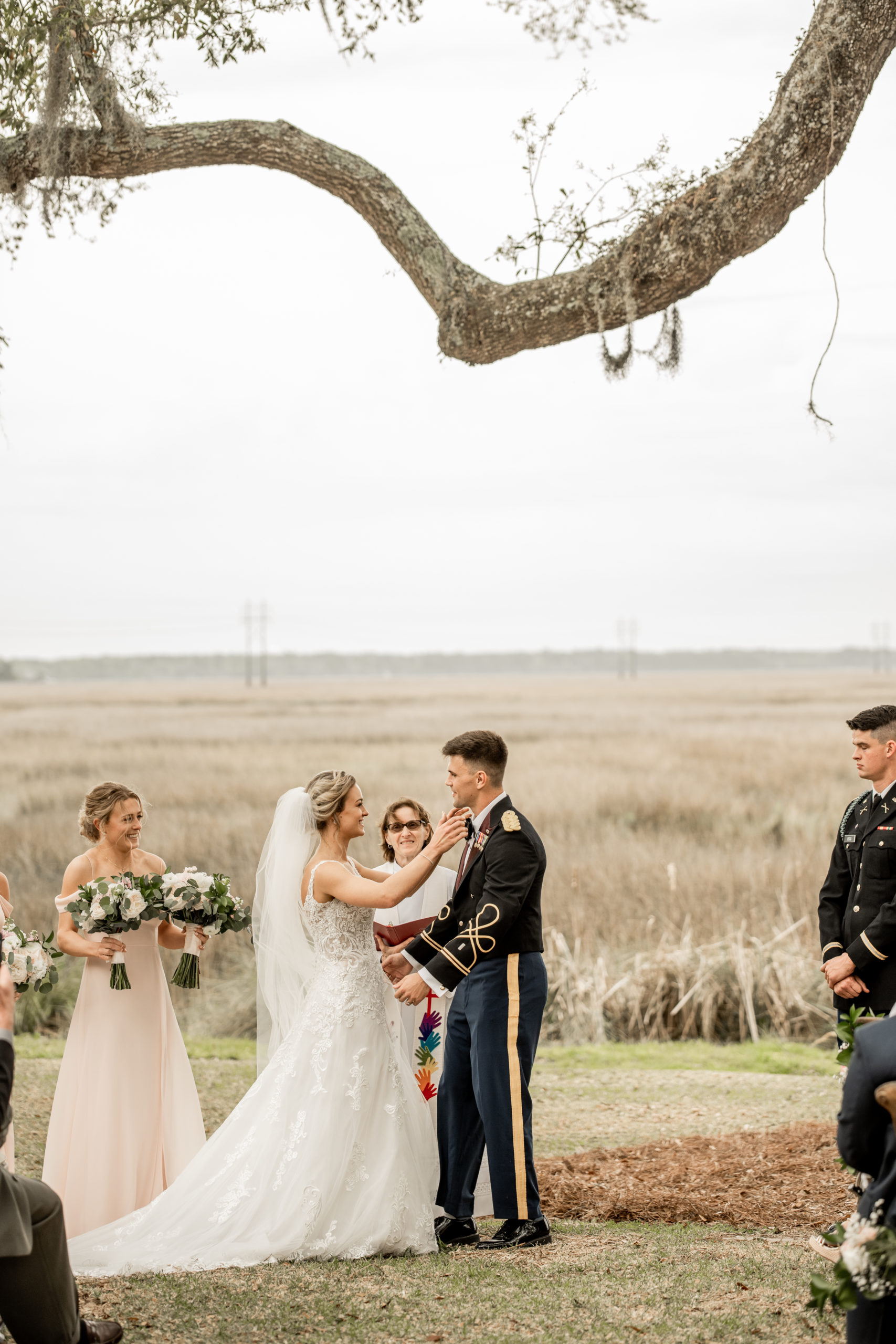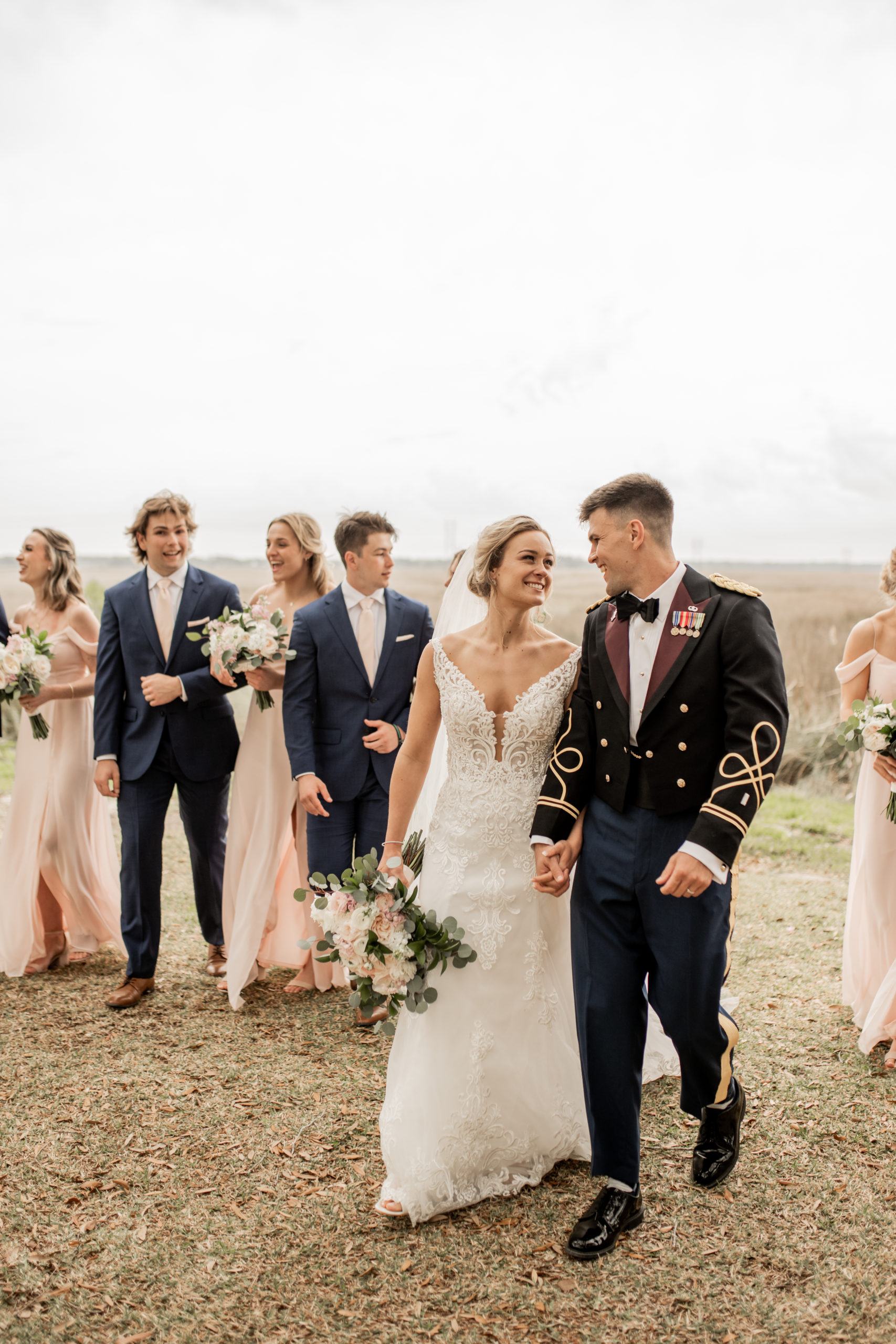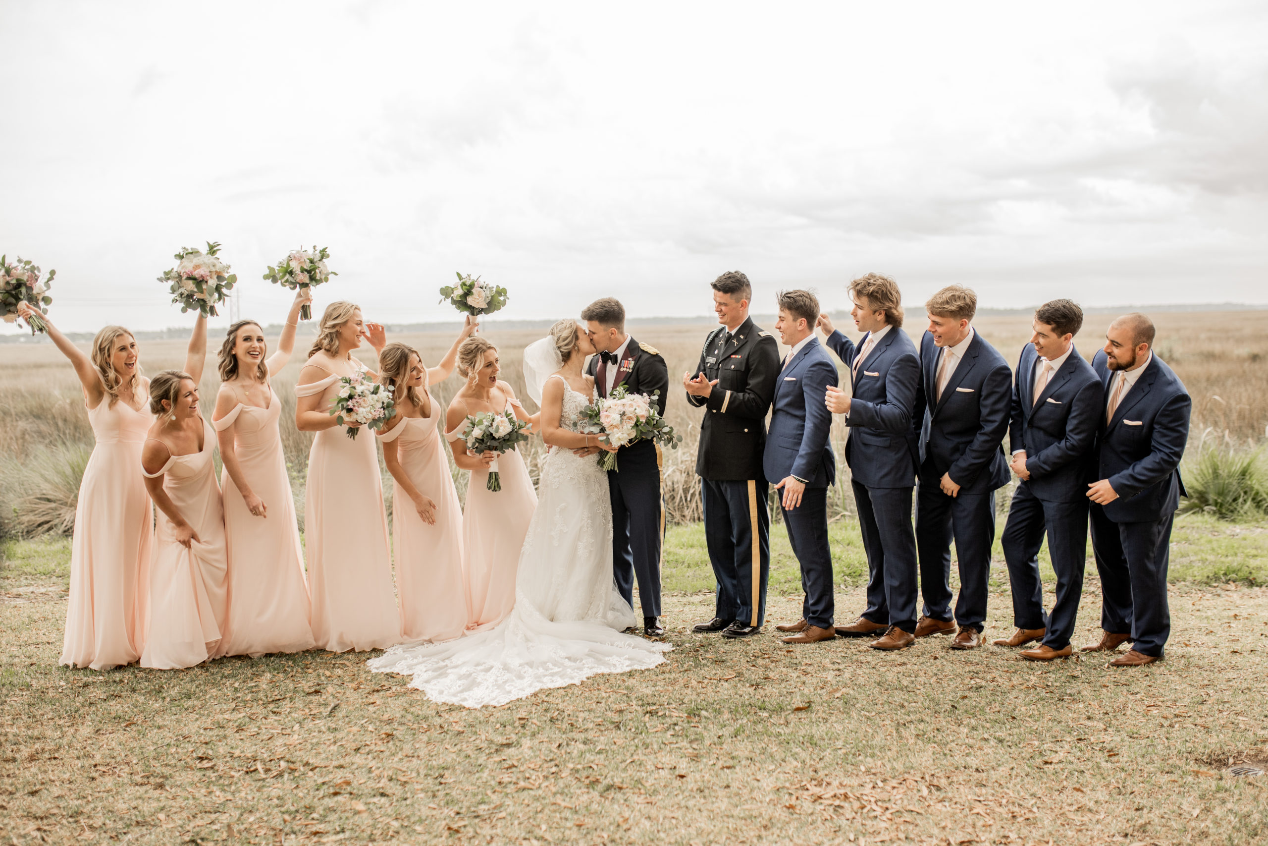 With a beautiful backdrop of the marsh, Ashley and Forrest tied the knot! It was a very emotional ceremony, but the bride’s brother actually cried more than anyone else! After sharing their personal, loving vows, the newlyweds exited through a traditional military sword arch (plus a sword tap on the booty!)