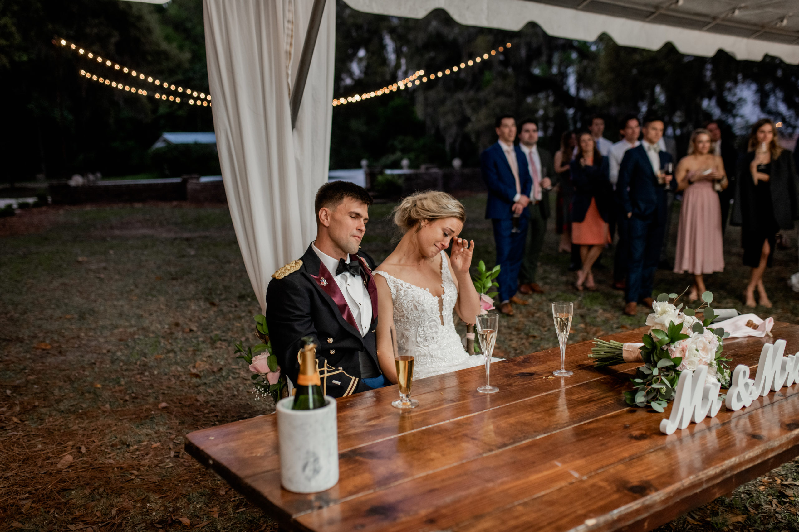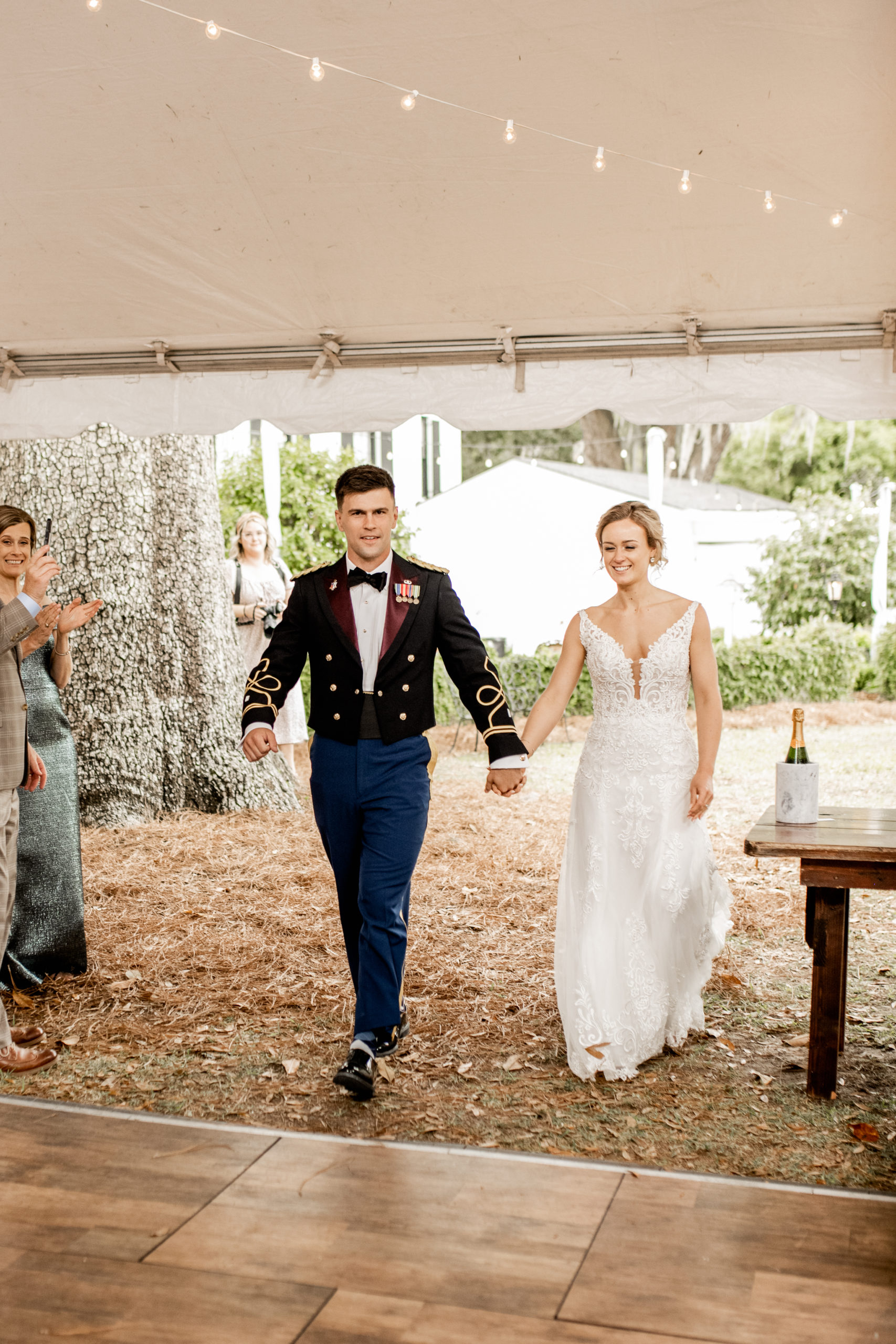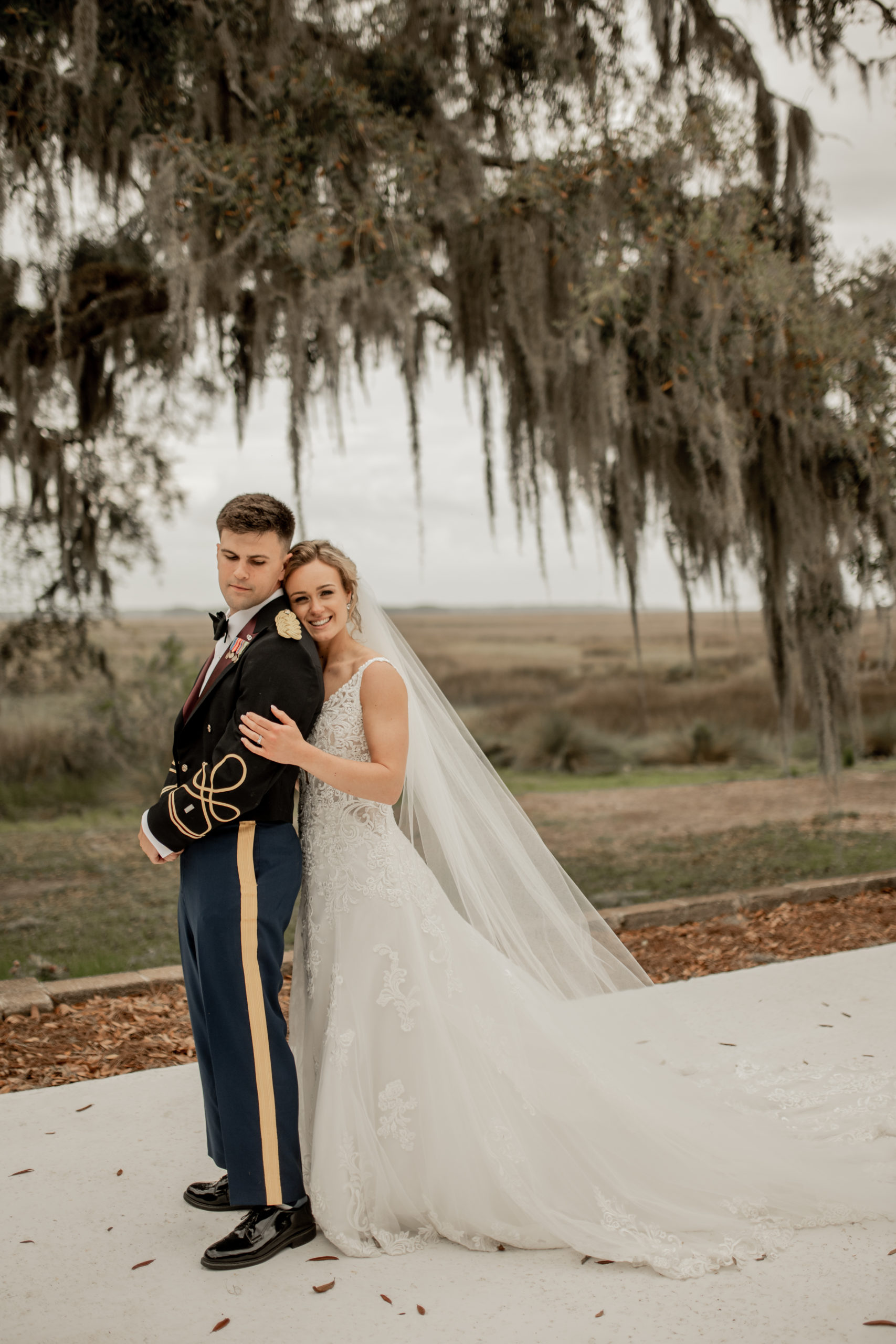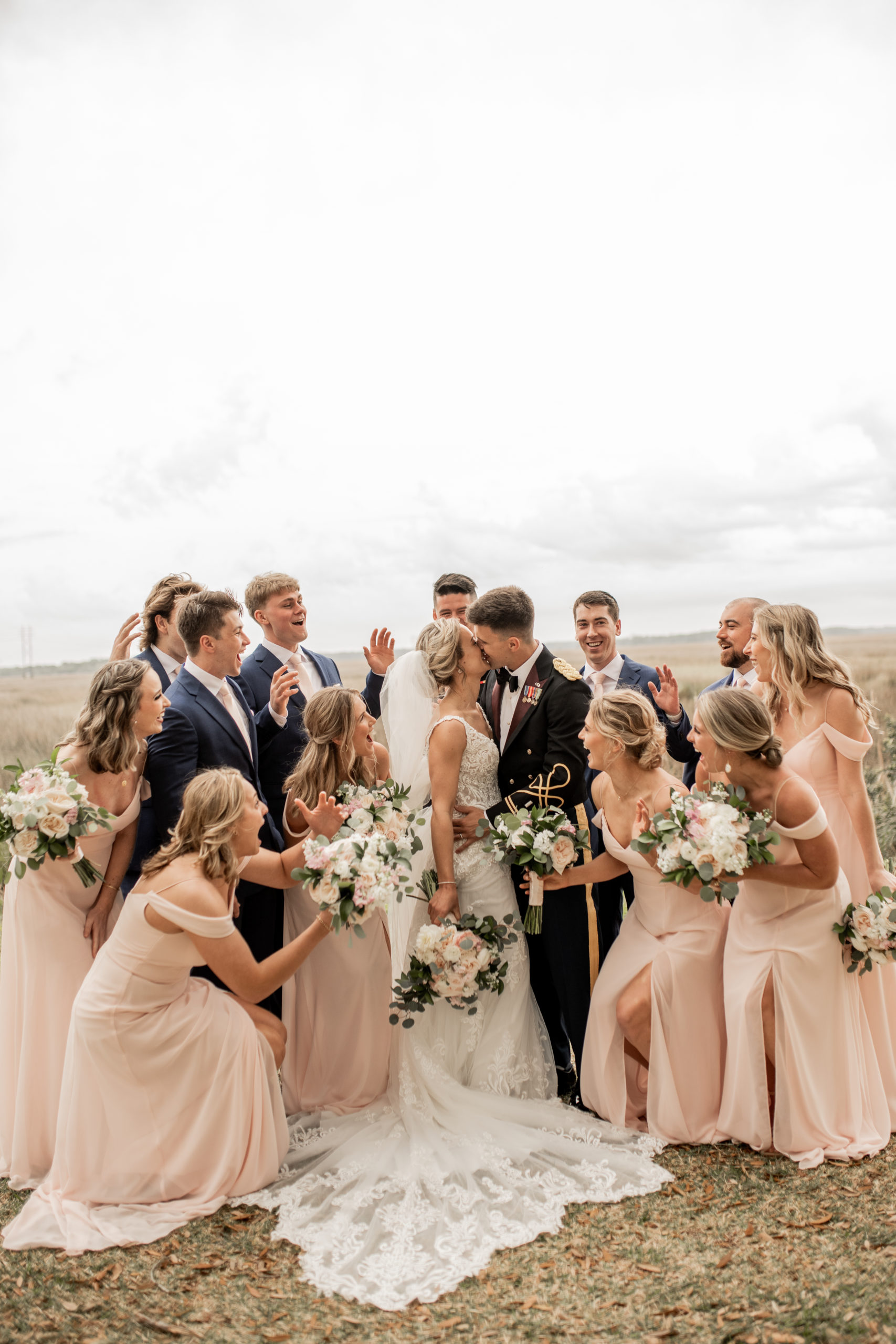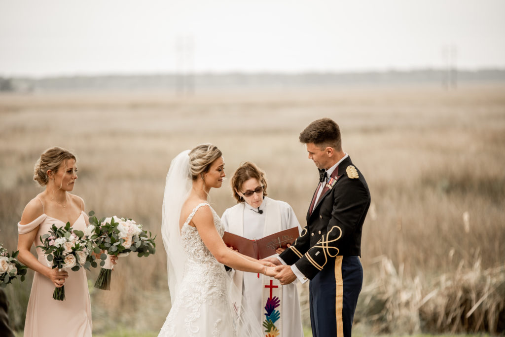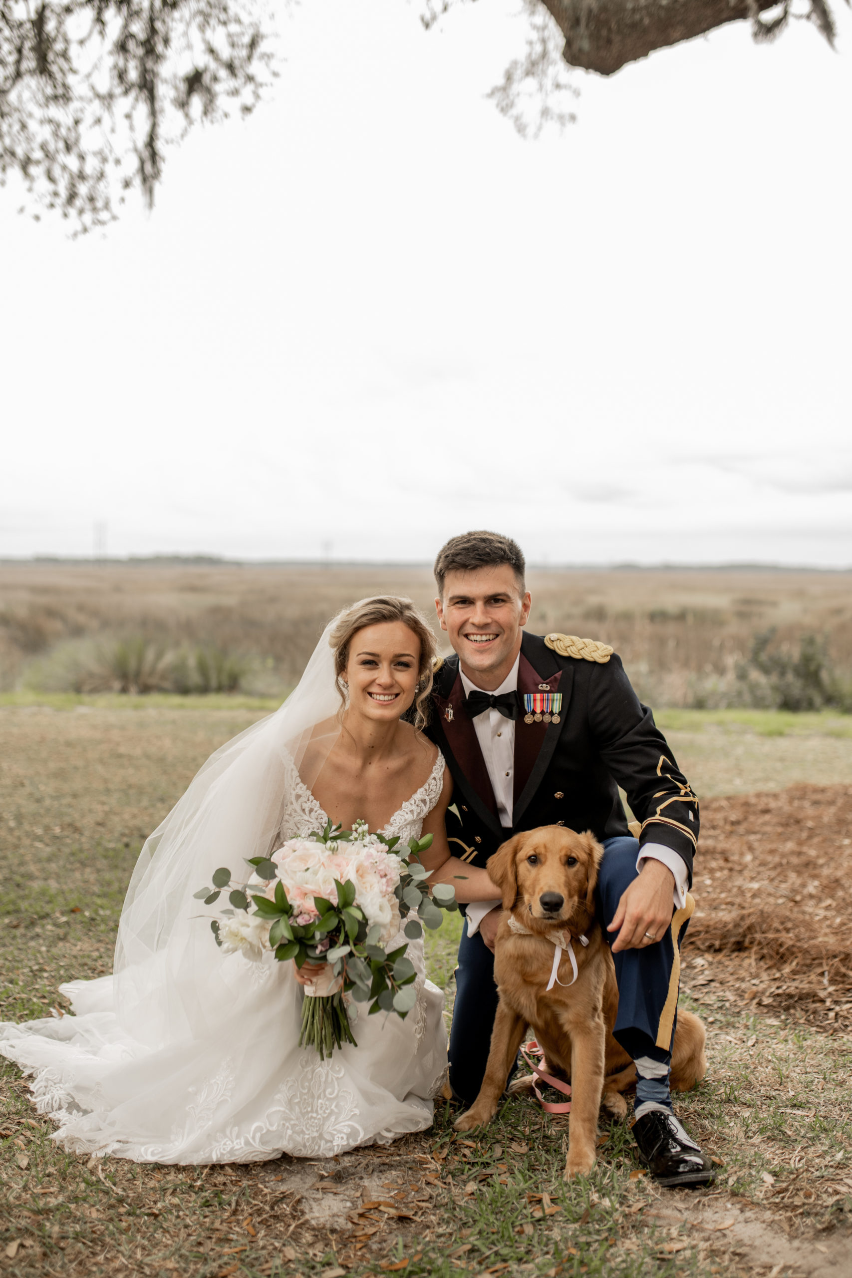 With a beautiful backdrop of the marsh, Ashley and Forrest tied the knot! It was a very emotional ceremony, but the bride’s brother actually cried more than anyone else! After sharing their personal, loving vows, the newlyweds exited through a traditional military sword arch (plus a sword tap on the booty!)