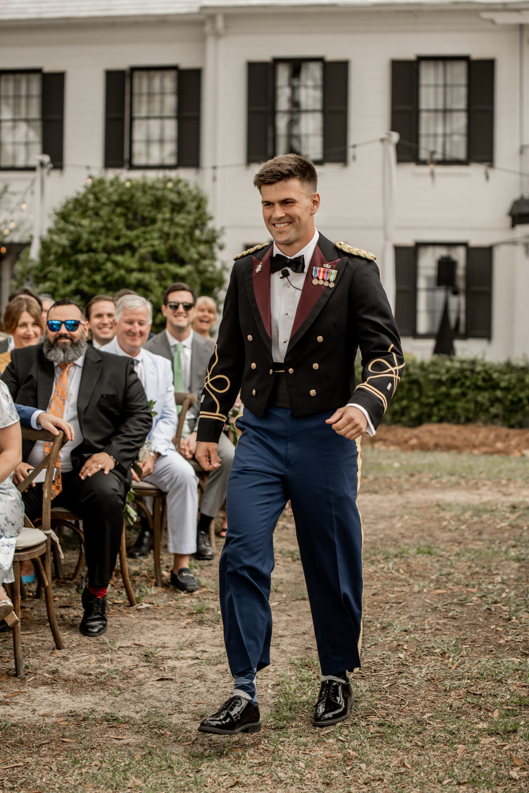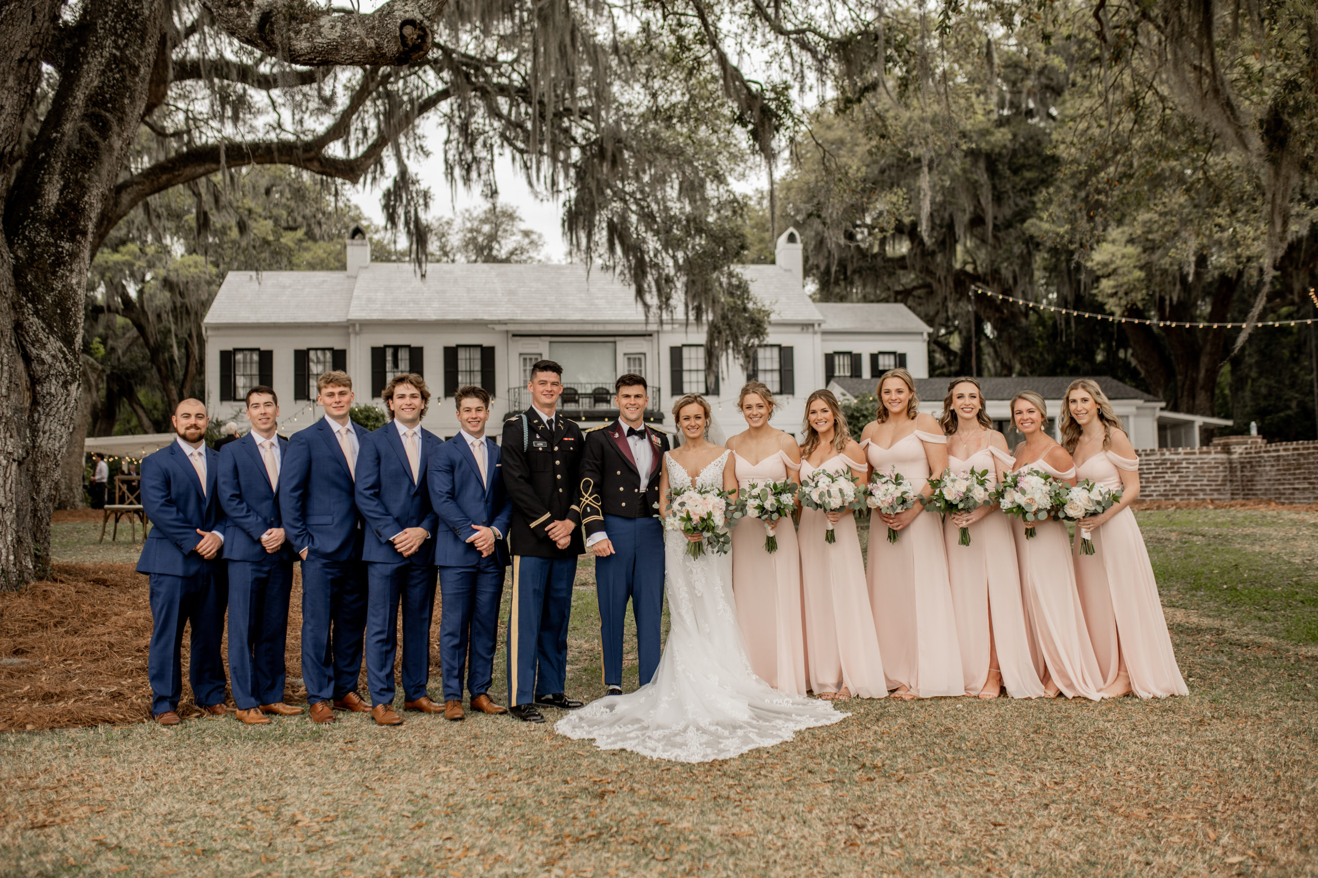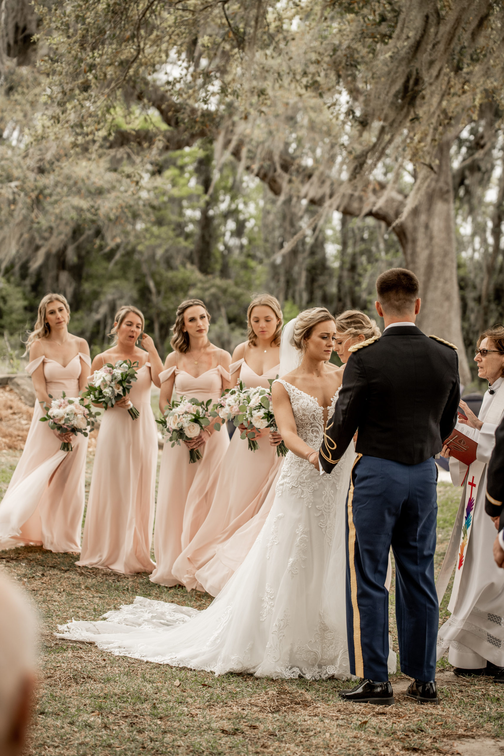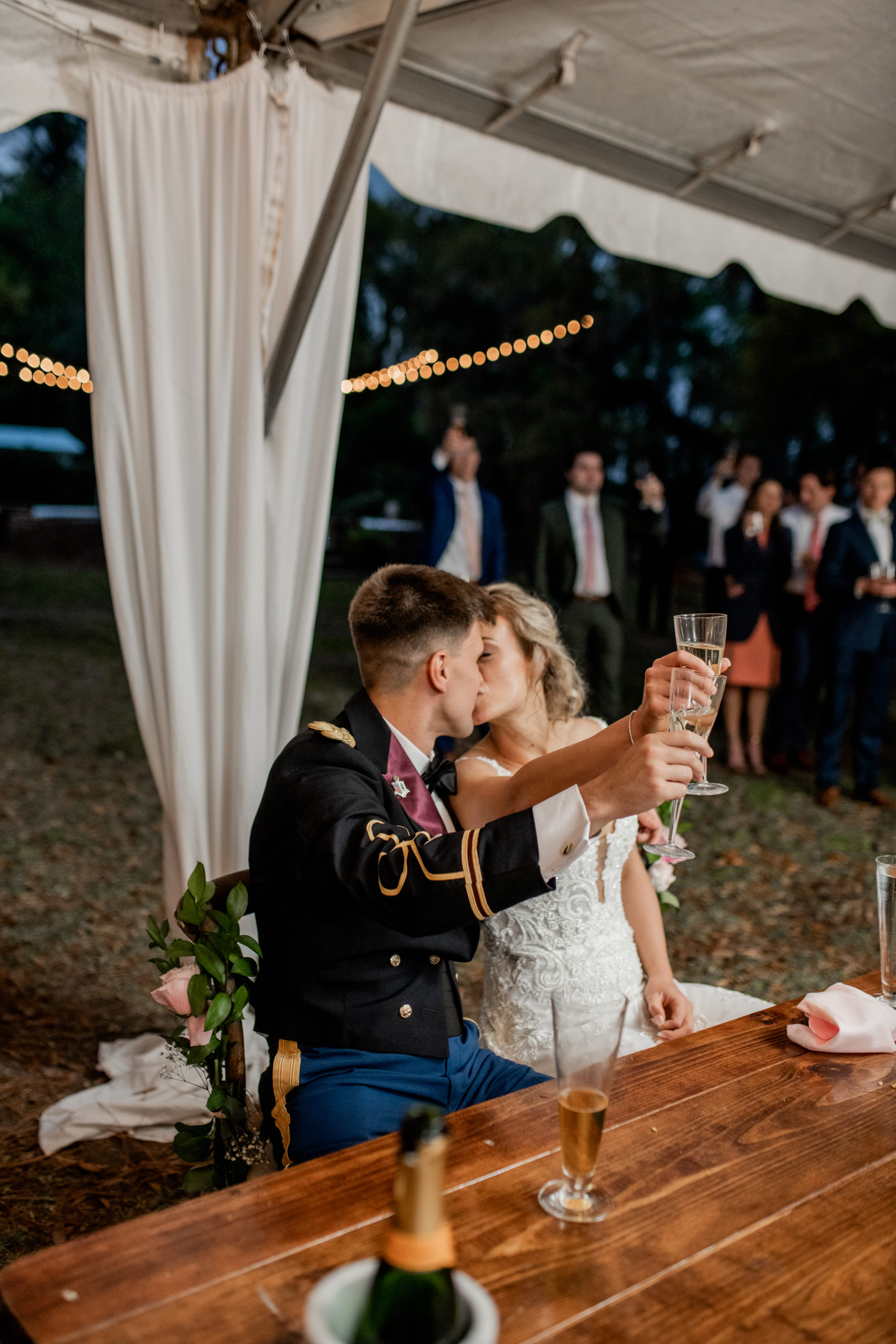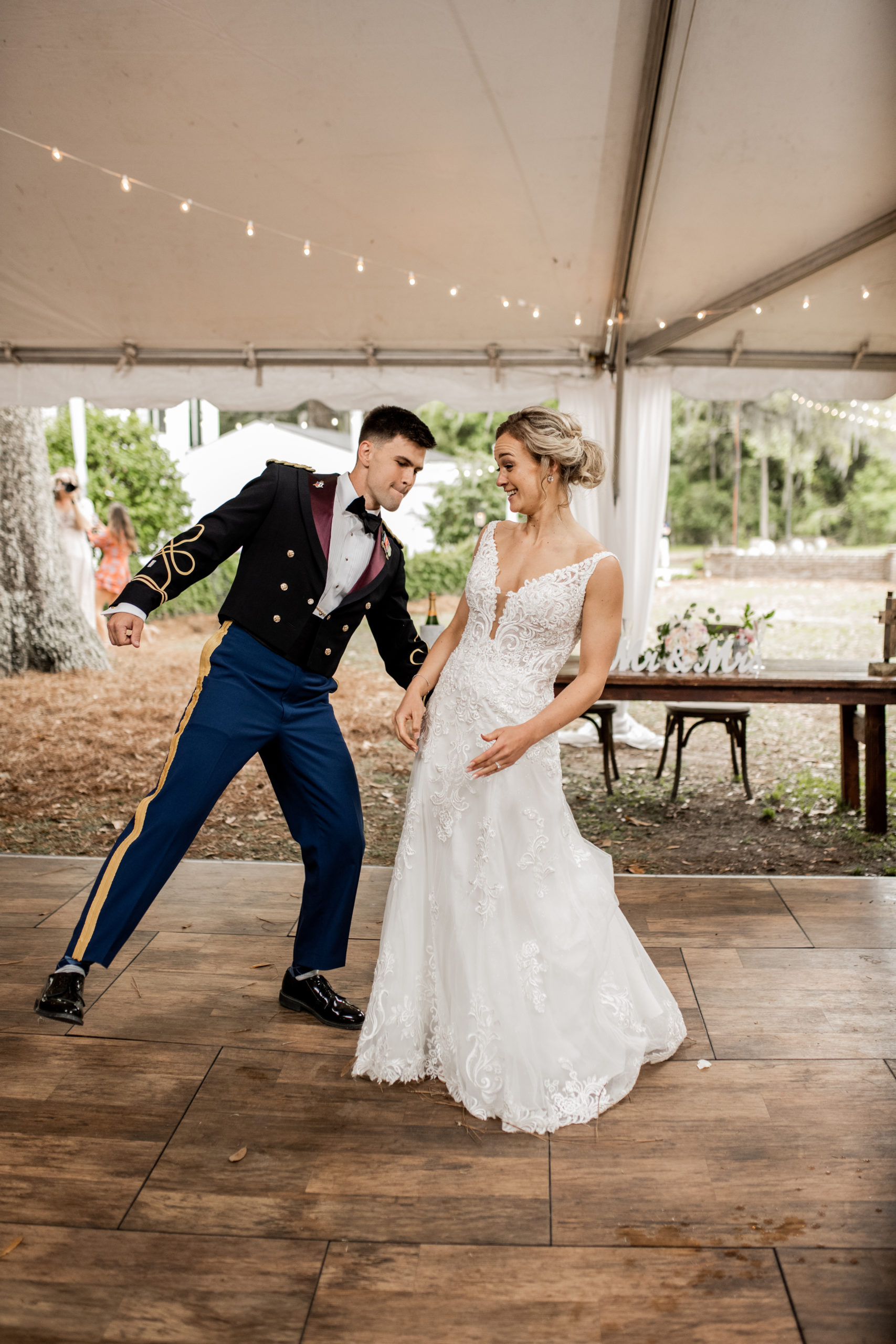 With a beautiful backdrop of the marsh, Ashley and Forrest tied the knot! It was a very emotional ceremony, but the bride’s brother actually cried more than anyone else! After sharing their personal, loving vows, the newlyweds exited through a traditional military sword arch (plus a sword tap on the booty!)
