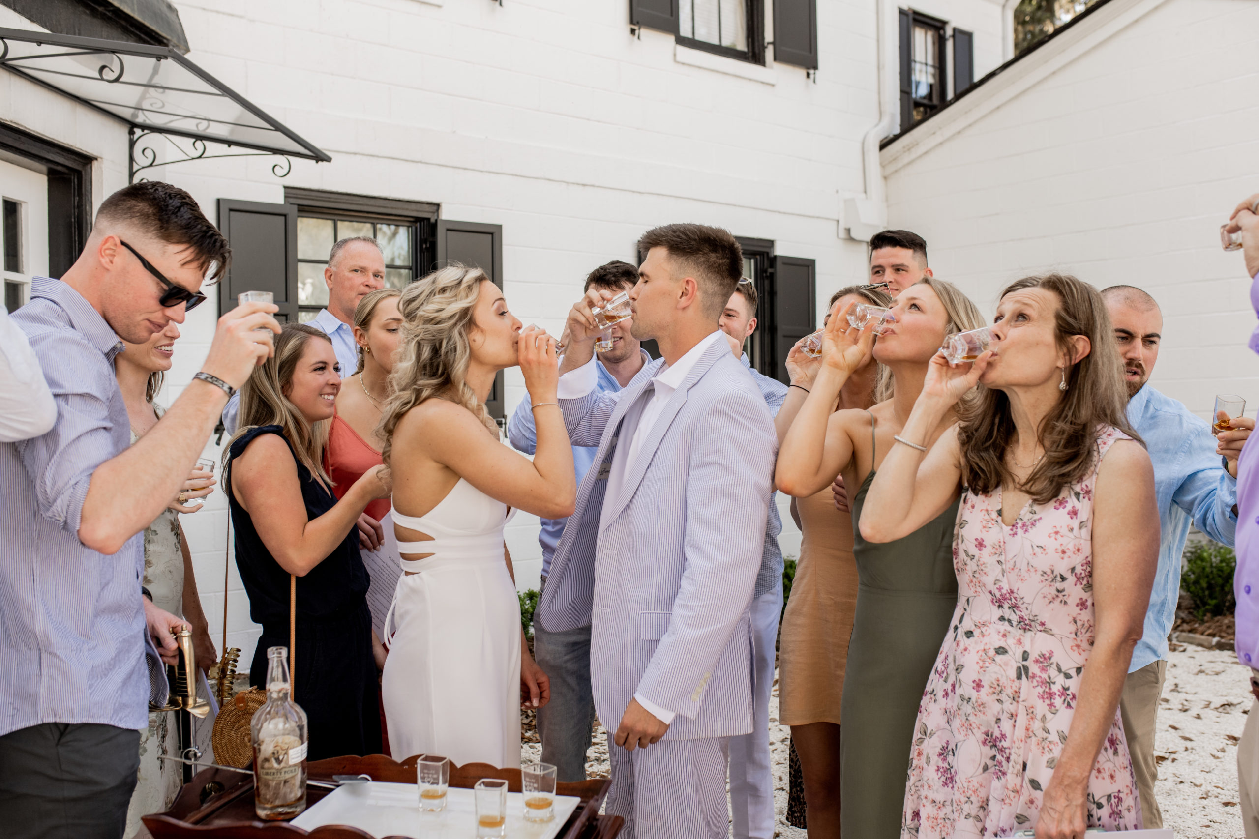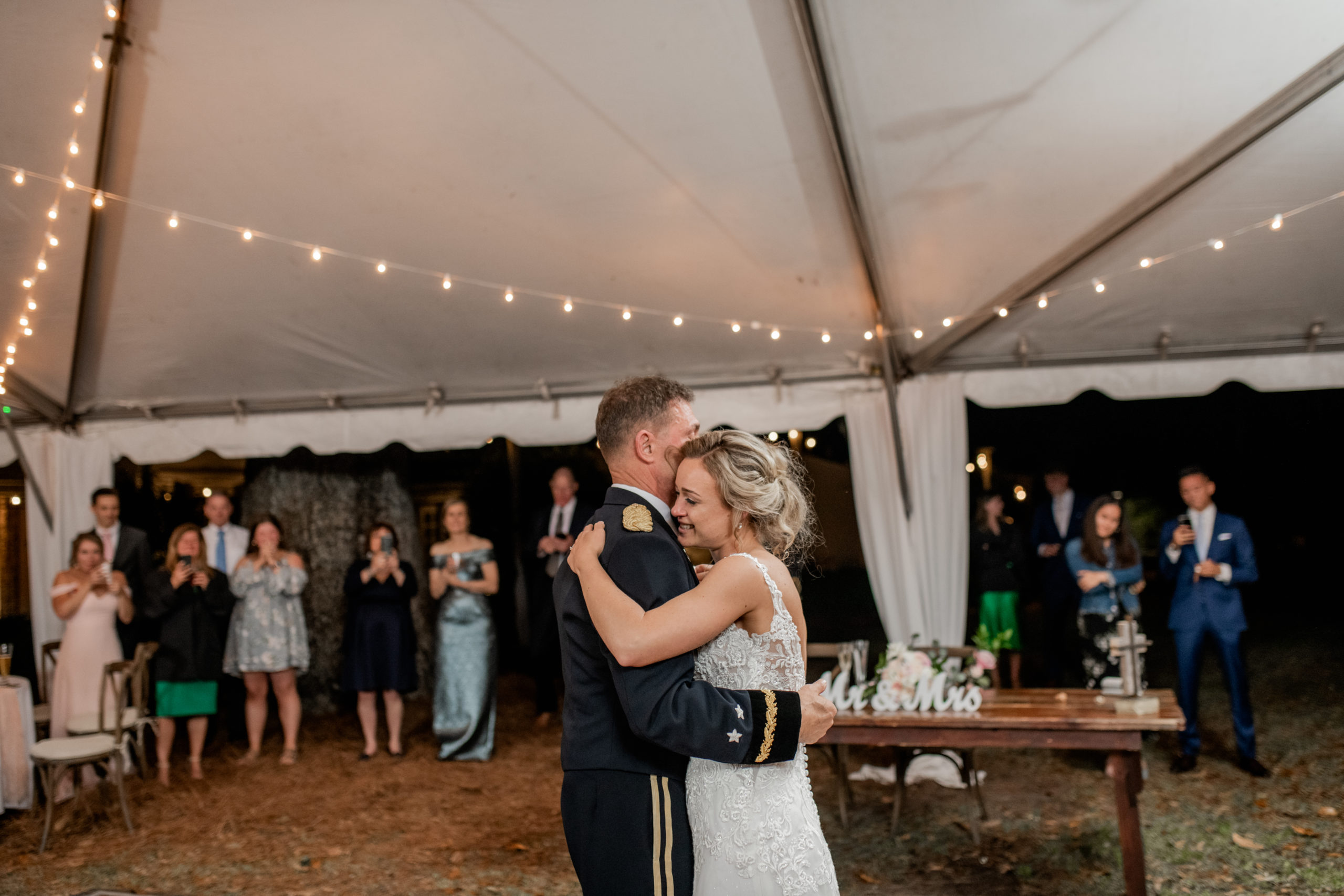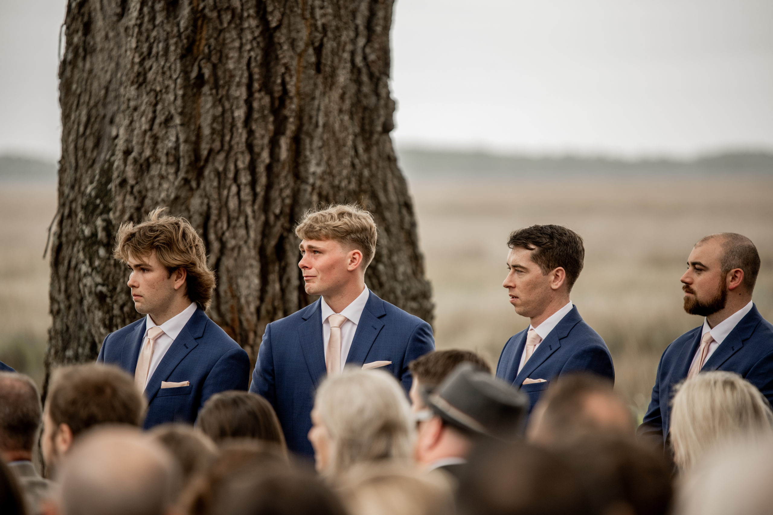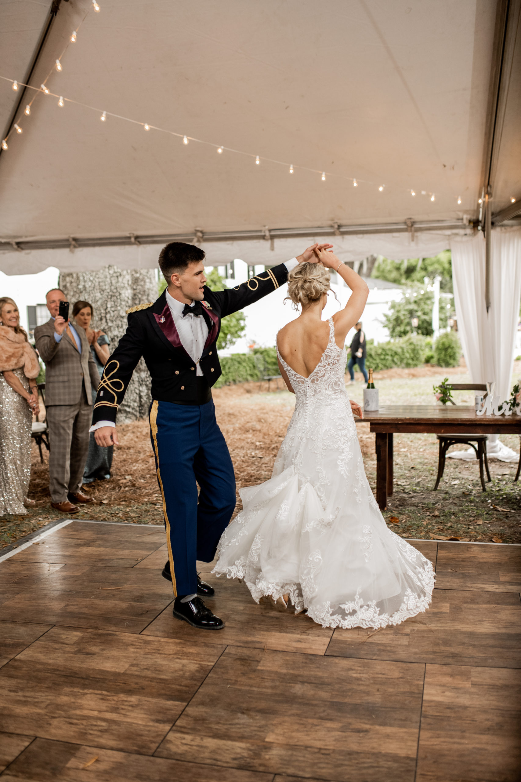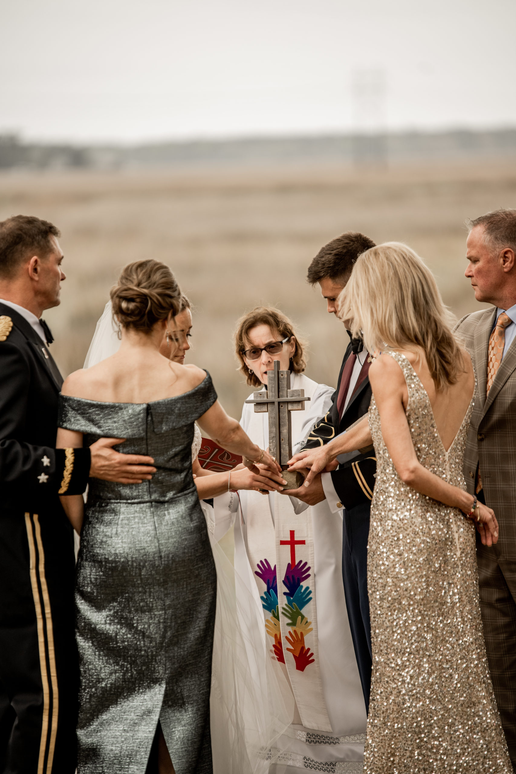 With a beautiful backdrop of the marsh, Ashley and Forrest tied the knot! It was a very emotional ceremony, but the bride’s brother actually cried more than anyone else! After sharing their personal, loving vows, the newlyweds exited through a traditional military sword arch (plus a sword tap on the booty!)