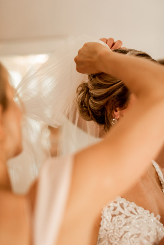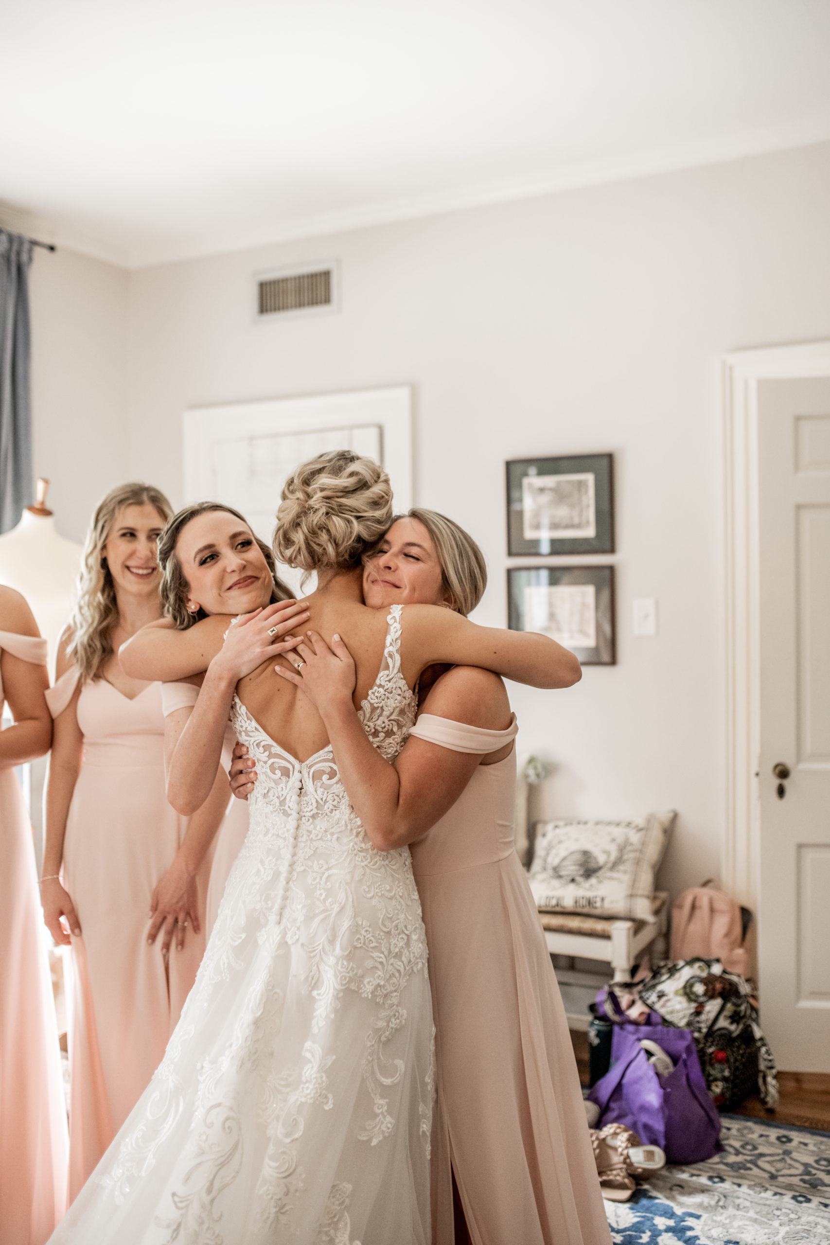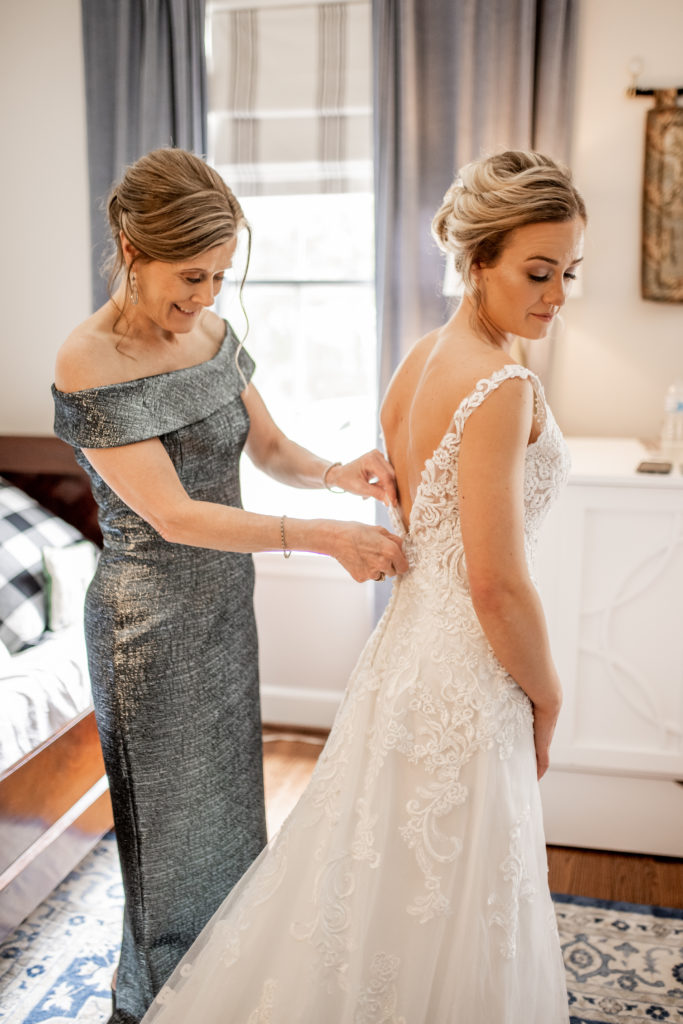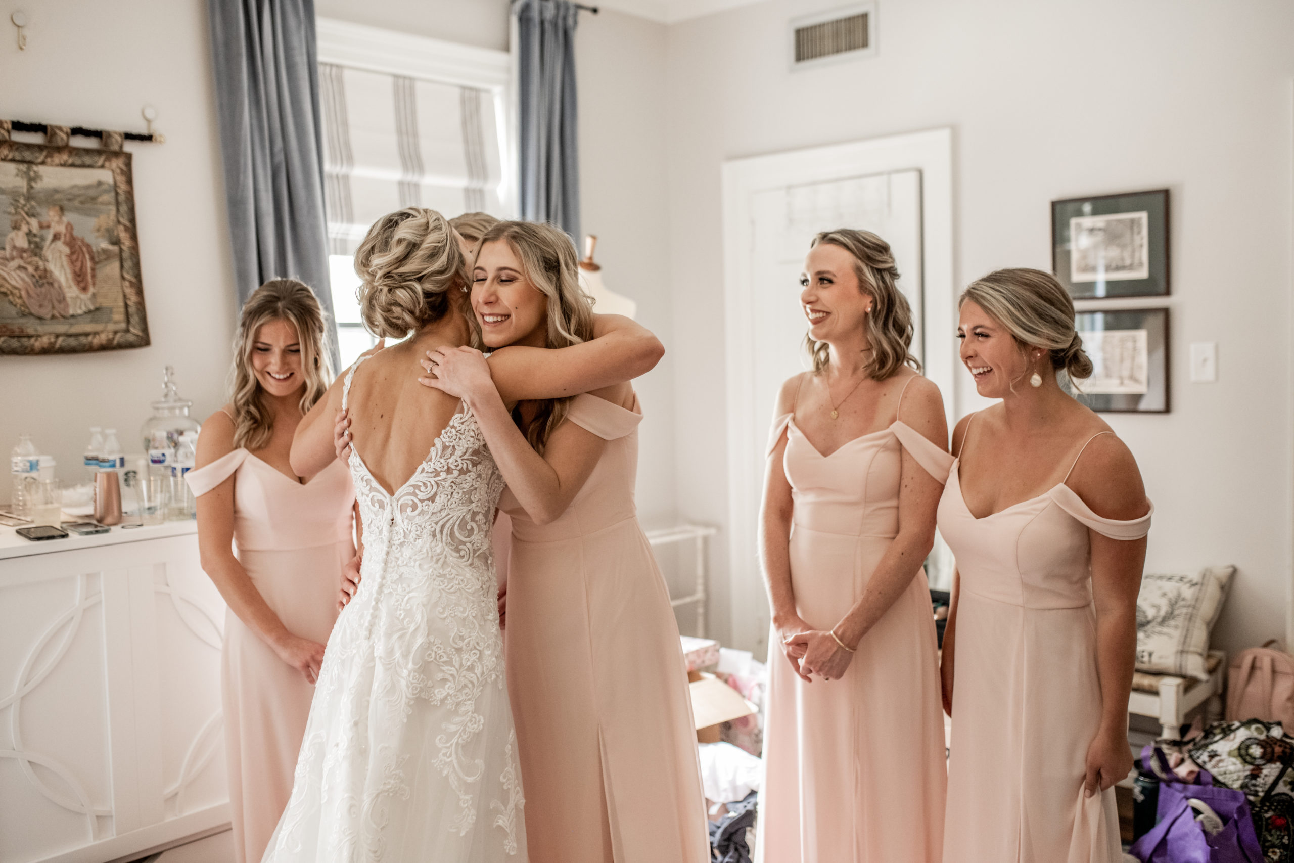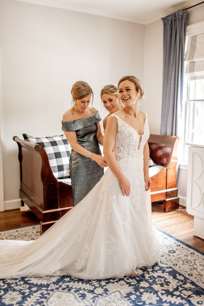 Ashley’s mother and sister helped her get into her lacy, flowy dream of a wedding dress. She then read a handwritten note from her husband-to-be, which is a great idea for couples who won’t see each other at all before the ceremony. Ashley didn’t completely forgo the first look, though, doing one with her bridesmaids and then a sweet moment with her dad.